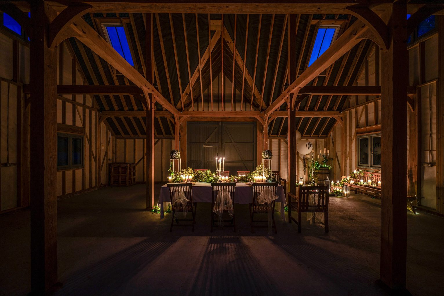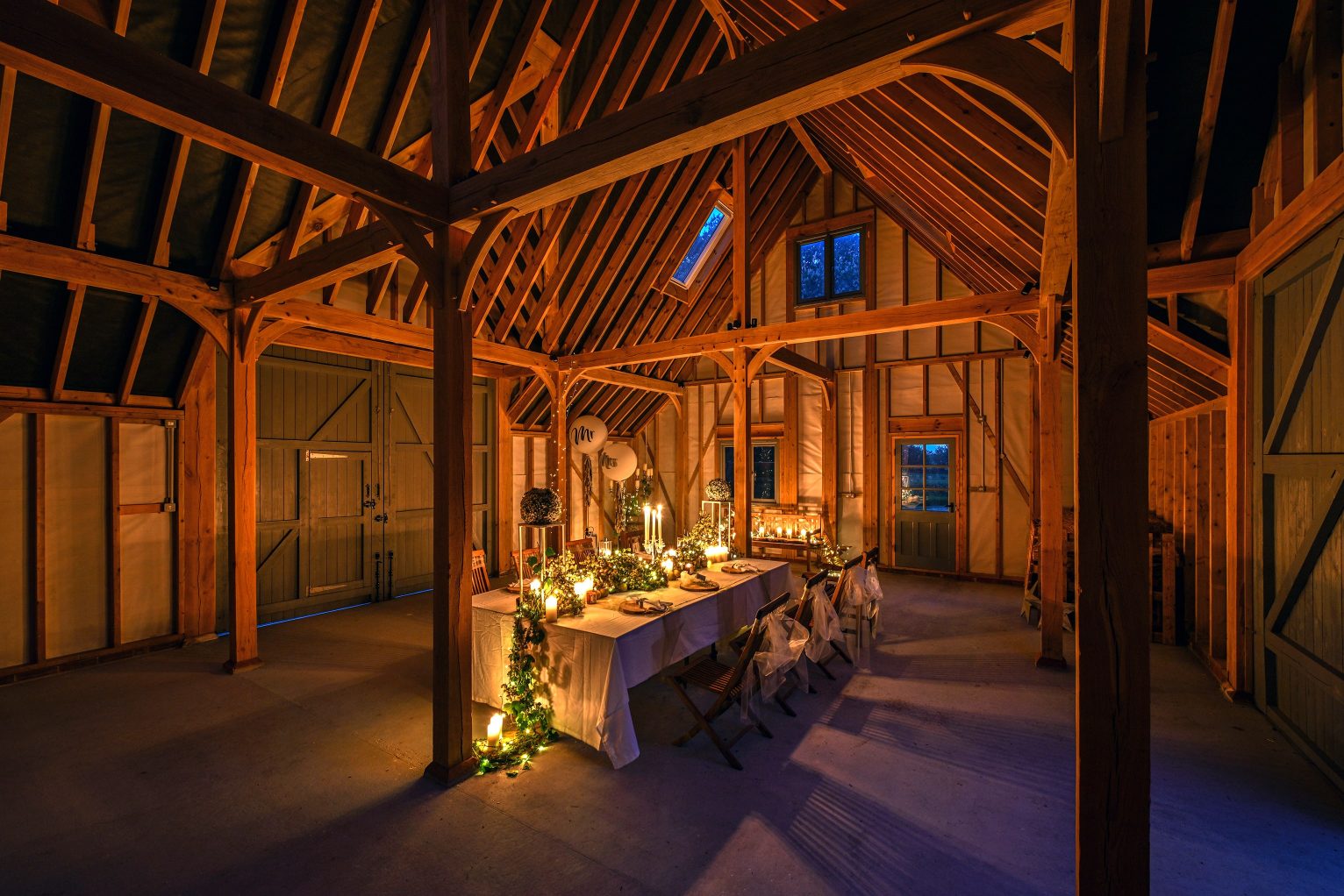 Windows in the roof and a gable end provide even more daylight, while the lighting design takes the oak framed party barn to a new level when night falls, perfect for evenings and cosy winter gatherings.