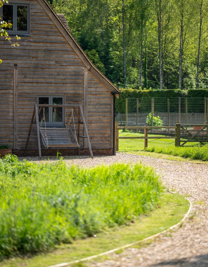 Our designer worked with the client to create a space that looks as beautiful inside as it does outside, opening onto their charming gardens. The dual-pitched roof ensures the barn sits comfortably in its surrounds. Head inside and visitors are greeted with a cathedralesque interior created by the vaulted ceiling spanned by tactile, sandblasted green oak beams.